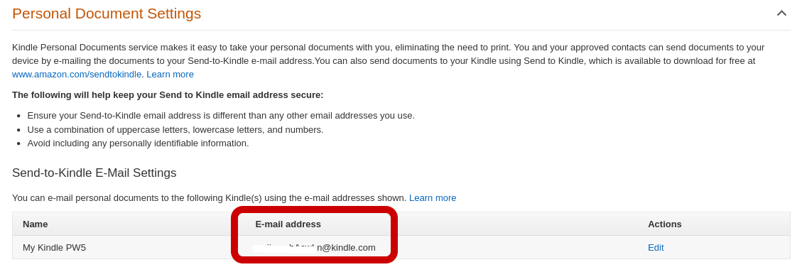 然后在页面下方的说明文字中找到红色大字体的信任邮箱(类似 kindle-数字.kindle4rss.com), 填入上一步亚马逊网站页面的“Approved Personal Document E-mail List”一栏。